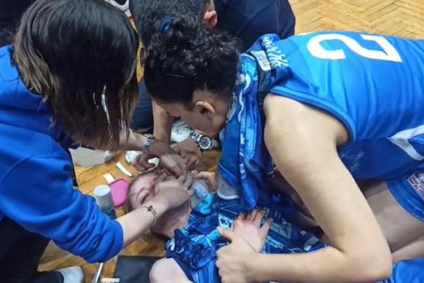 Olay sırasında kaşı yarılan Bodrum Basketbol'un oyuncusu Eydina Topçu, sahadaki ilk müdahalenin ardından hastaneye kaldırıldı.