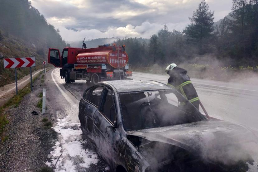 BURDUR'un Bucak ilçesinde seyir halindeyken motor kısmından alev alan otomobil kullanılamaz hale geldi.