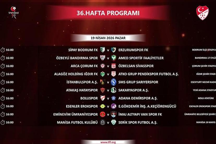 Trendyol 1. Lig'de 36. hafta programı şu şekilde: